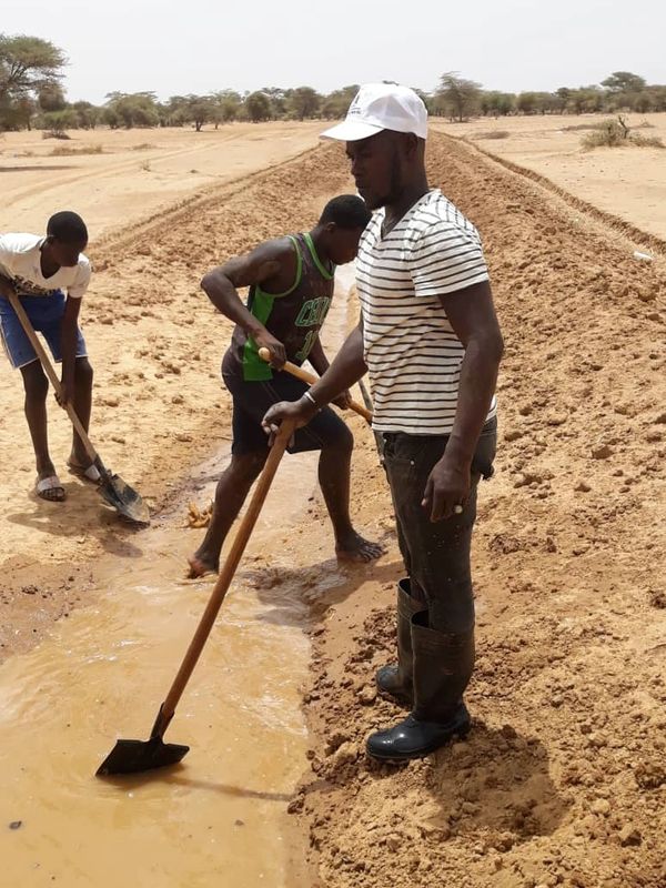 Basic farm equipment including hoes, shovels, pick, glove, boots